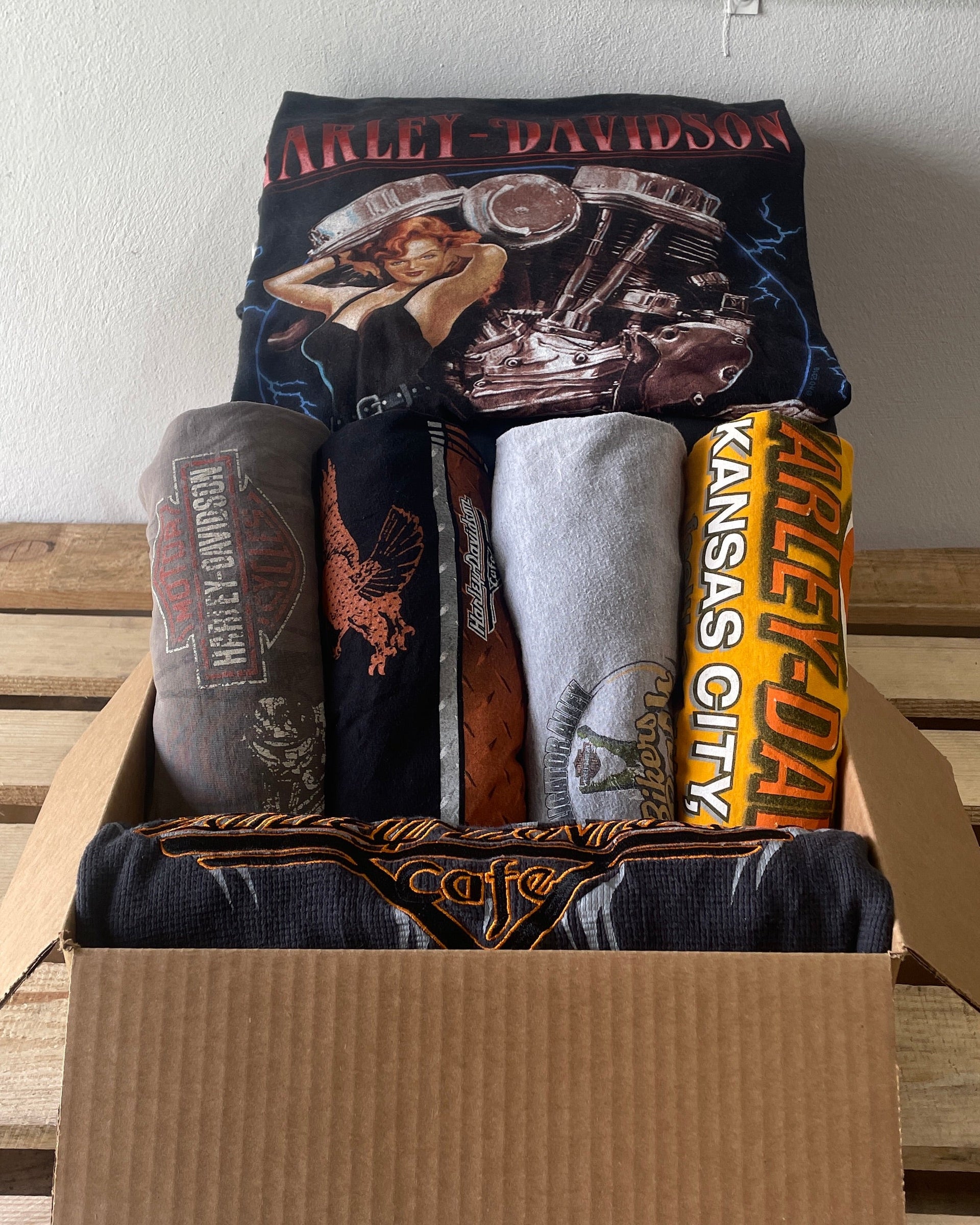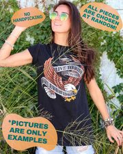 We handpick your order to include quality items featuring a varied mix of retro Harley graphics, slogans, logos, branded designs, and so much more. We also include a small amount of Bike Week and Sturgis brand shirts along with some of our more distressed looks. Harley Davidson t-shirts make great gifts for the motorcycle lover in your life, too. Order your pack today!