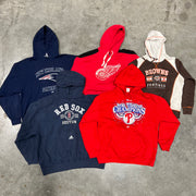 Expect a good mix of vintage and retro sports hoodies from the 80s-present day. This bundle will not include crewneck sweatshirts. And will include a mix of vintage & retro NFL hoodies, vintage & retro NBA hoodies, vintage & retro MLB hoodies, and vintage & retro NHL hoodies. Our vintage and retro NBA, NFL, MLB, and NHL sweatshirts mystery boxes are among our #1 best sellers. This vintage & retro sports hoodie mystery box is popular with all our customers. Our mystery box is perfect for someone who loves thrifting and understands the nature of buying secondhand clothing. You will find a mix of retro and vintage hoodies. You will find a majority of this mix is men's sports hoodies but today are worn unisex, as women love wearing oversize sports hoodies. This mix includes sports hoodies from America's most popular sports teams. Find a combination of vintage sports hoodies and retro sports sweats, including retro & vintage NBA hoodies, retro & vintage NFL hoodies, retro & vintage MLB hoodies, and retro & vintage NHL hoodies.