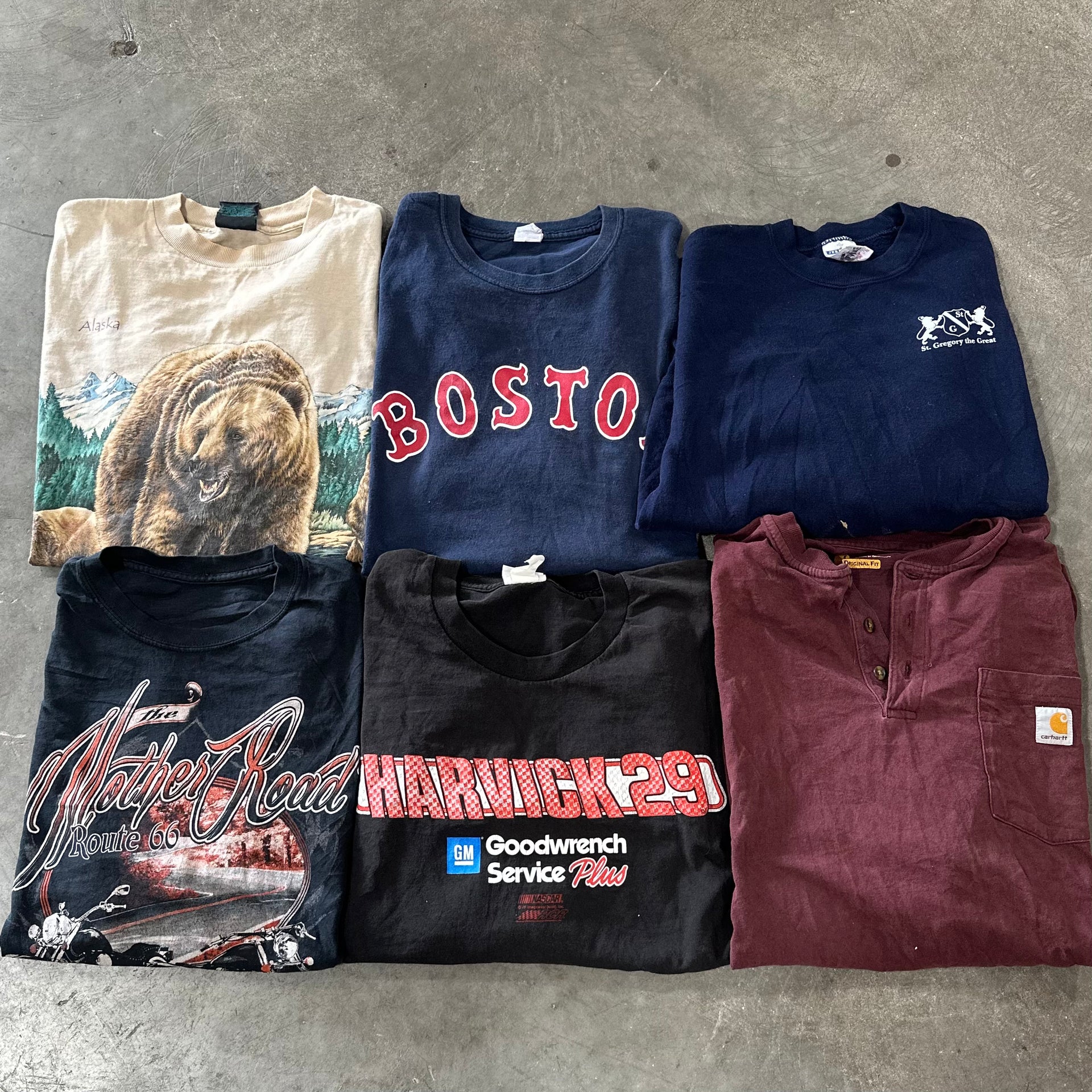 Our t-shirt bundles come in mixed sizes, mens S-2XL with a smaller percentage being Small or 3XL+. Expect more sizes M-2XL in this mix.