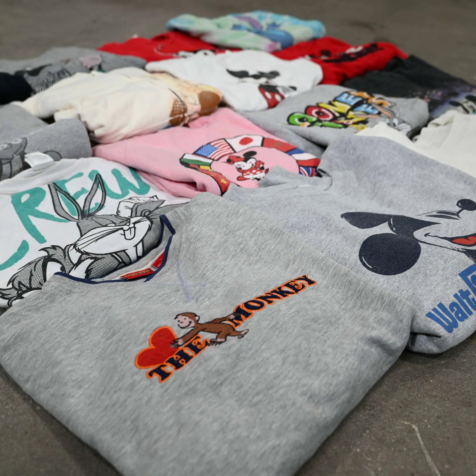 Our DISNEY & CARTOON SWEATSHIRT MIX includes a variety of sweatshirts featuring iconic American cartoon characters.
