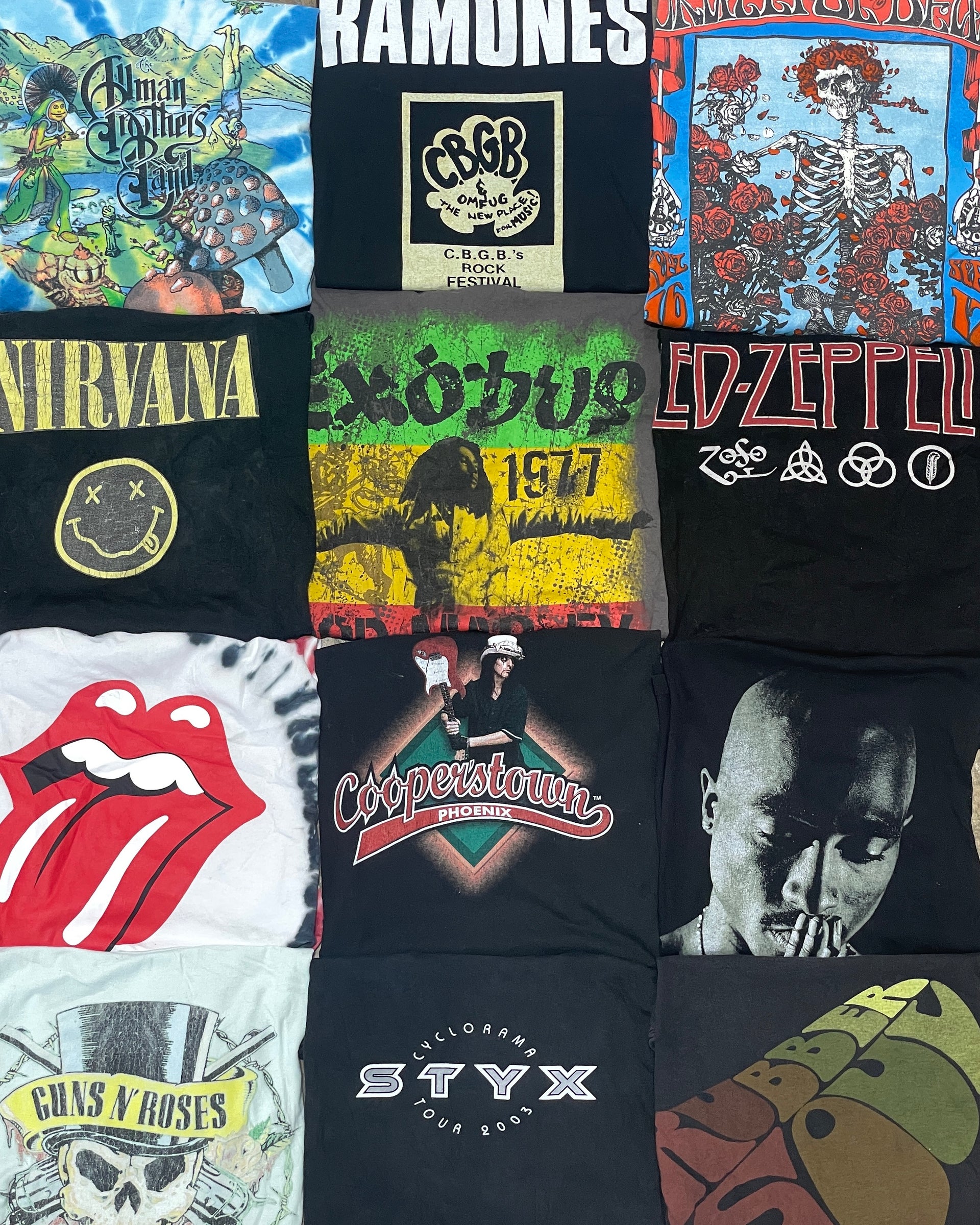 The majority of this mix includes Rock tees but we also include Country music t-shirts, Pop music t-shirts, R&B/Rap music t-shirts, and some Reggae music t-shirts. Most tees in this mix are rock tee reproductions made in the 2000 and 2010s. You will find a mix of all music graphic tees such as a Metallica graphic tee, Nirvana graphic tee, Pink Floyd graphic tee, Aerosmith graphic tee, AC/DC T-shirts, The Rolling Stones graphic tees, Red Hot Chilli Peppers T-shirt, Queen Graphic tee, Bob Marley t-shirt, The Beatles T-shirt, Garth Brooks t-shirt, Michael Jackson graphic tee, Tupac T-shirt, Biggie Smalls T-shirt and a Modanna T-shirt.